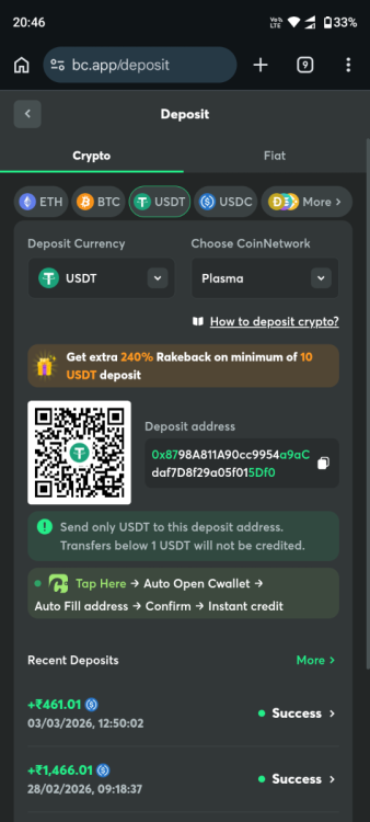 I had deposited USDT on Plasma network in bc.game but it was not credited.