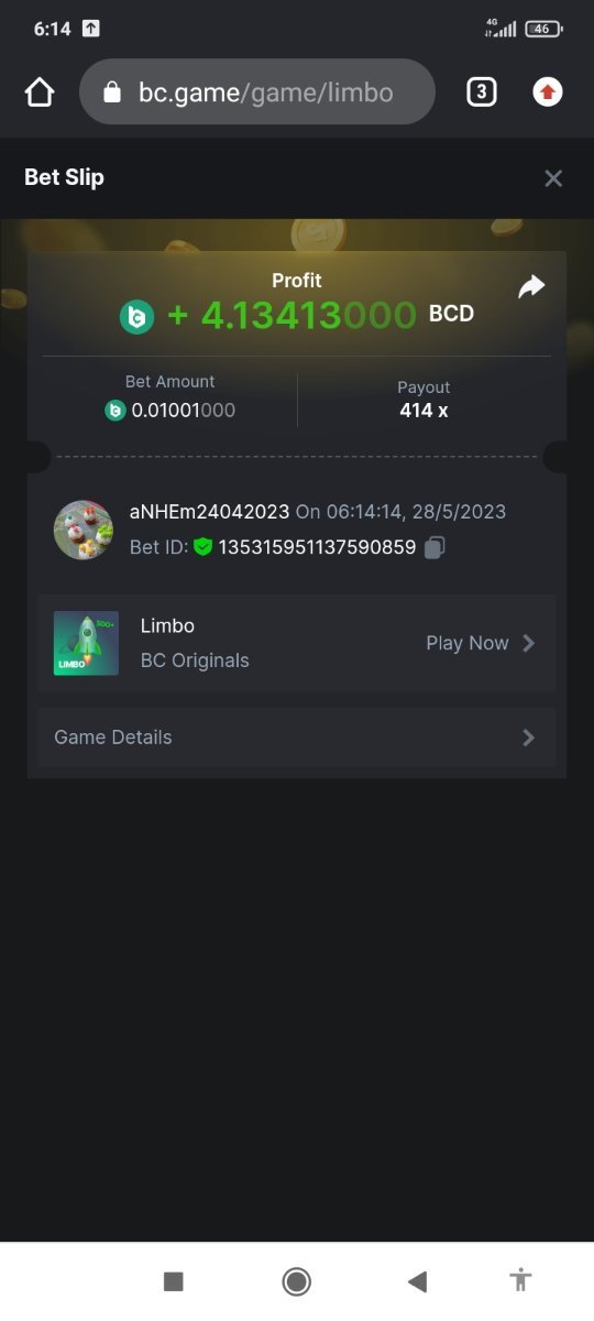 Maksypro Posted May 27, 2023 Share Posted May 27, 2023 Read Carefully Before Start To Hunt Daily Challenges #248 LIMBO ย Hunt : Win the highest pay out Min Payout requirement 100x Min Level 4 ๏ธDuration Starting : Now End time : 23.59 UTC Time How to Join? Make screenshot + paste your bet link + UID or Profile link Any coin, with min bet 0.01 USD is allowed (jb/bb/bcl not allowed) Reward Prizes 1st Place.....$7 BCD 2nd Place.....$5 BCD 3rd Place.....$4 BCD 4th Place.....$3 BCD 5th Place.....$2 BCD ๐ต Winners will be announcing next day after Roll Point! 1 Link to comment Share on other sites More sharing options...