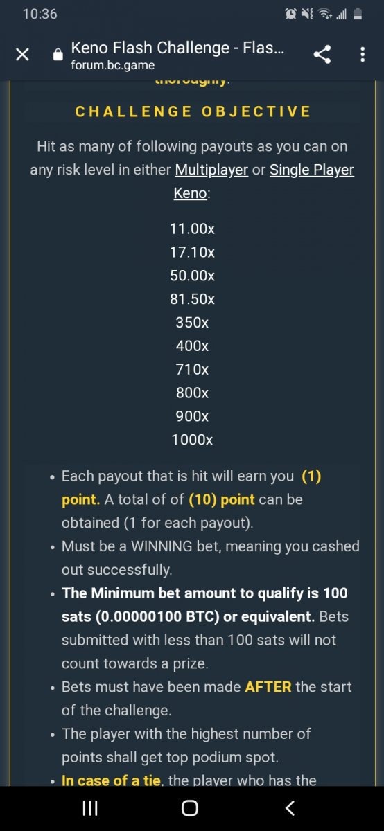 misskenn84 Posted November 7, 2020 Share Posted November 7, 2020 On 11/6/2020 at 11:54 AM, Salty said: R U L E S + D E T A I L S The rules for this flash challenge are listed below, please pay close attention and make sure to read thoroughly. C H A L L E N G E O B J E C T I V E Hit as many of following payouts that are listed as you can on any risk level in either Multiplayer or Single Player Keno: 11.00x 17.00x or 17.1x 50.00x 80.00x or 81.5x 350x 400x 710x 800x 900x 1000x Each payout that is hit will earn you (1) point. A total of of (10) point can be obtained (1 for each payout). 17x/17.1 have been adjusted so that you can hit either value can be hit. You will only be awarded one point for the 17.00/17.1x category even if both are hit. 80x/81.5x have been adjusted so that you can hit either value can be hit. You will only be awarded one point for the 80x/81.5x category even if both are hit. Must be a WINNING bet, meaning you cashed out successfully. The Minimum bet amount to qualify is 100 sats (0.00000100 BTC) or equivalent. Bets submitted with less than 100 sats will not count towards a prize. Bets must have been made AFTER the start of the challenge. The player with the highest number of points shall get top podium spot. In case of a tie, the player who has the highest total amount wagered across all bets will be the winner. If still tied, whoever posted first will be deemed the winner. One (1) entry submission per household - anyone caught trying to use multi accounts for the promo will be banned from this challenge along with all future ones. Play fair. Challenge ends on 11/08/2020 - this thread will automatically lock once challenge is over. Check to see when the thread locks for the exact time of when it ends compared to your local time. How To Submit your Entry Take a screenshot displaying the round detail like so and send a reply to this thread with it: Must be able to see betting ID so that your bet can be verified. Please do not make multiple posts, just edit your original one if you need to add a new payout or replace a payout with a better qualifying amount. PRIZE DISTRIBUTION For this particular flash challenge, we’ll be offering spots for 1st, 2nd and 3rd place. Prizes are as displayed below. 1ST ....... $200 2ND ...... $100 3RD ....... $50 ...But wait, that's not all! Valid participants who hit at least 4 out of the 10 payouts will receive a portion of a $350! BONUS: Hitting all 10 numbers guarantees you 0.25 ETH in addition to any podium position prizes you may qualify for -- Prizes will be paid directly to the winning accounts upon verification within 24 hours of challenge ending. Only valid entries that meet the challenge requirements will qualify for the prize pool, - bets must have been made after this challenge was created and must be placed with a minimum bet amount of 100 Sats or equivalent. We reserve the right to deem a player ineligible for this challenge if they are banned from the site or were found to be attempting to manipulate it in any way. Link to comment Share on other sites More sharing options...